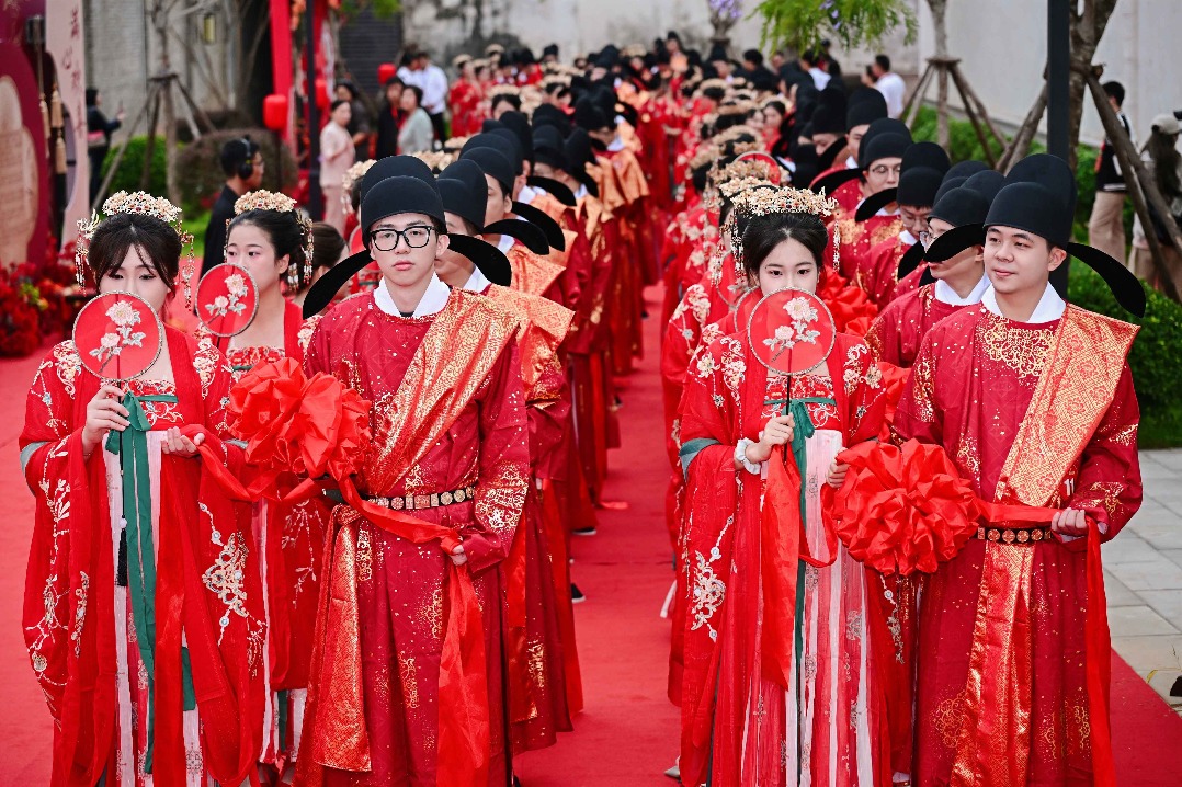 In a breathtaking display of cultural heritage, Fuzhou, the capital of Fujian Province in East China, hosted a magnificent collective ancient wedding ceremony on Tuesday. The event took place in the Shangxiahang historical and cultural block, where 100 newlywed couples, adorned in traditional Chinese wedding attire, exchanged vows amidst heartfelt blessings. This ceremony not only celebrated their union but also revived the rich traditions of ancient Chinese matrimonial customs. The streets were transformed into a scene of timeless romance, decorated with vibrant red ribbons and festive ornaments. Accompanied by the melodious strains of classical music, the couples, dressed in Tang Dynasty-inspired wedding garments and holding red silk ribbons, gracefully descended the ancient stone steps. Their journey symbolized the blending of history and modernity, culminating in a traditional ceremony that was met with joyous applause from onlookers. This event highlighted the enduring charm of Chinese cultural traditions and provided a unique start to the couples’ new lives together.