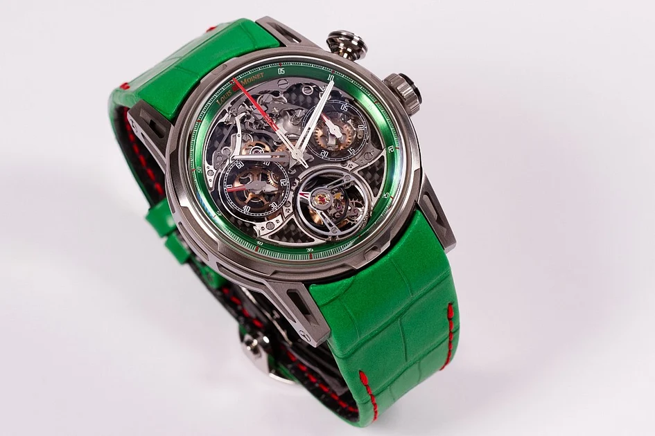 Louis Moinet has once again pushed the boundaries of haute horology with the unveiling of its exclusive Impulsion Titanium Green at Dubai Watch Week 2025. This 12-piece limited edition timepiece redefines the brand’s signature tourbillon-chronograph architecture, blending bold aesthetics with technical mastery. Designed specifically for the prestigious event, the watch embodies Louis Moinet’s philosophy of merging mechanical precision with emotional resonance. The Impulsion Titanium Green is a statement piece, characterized by its striking green accents, sculptural titanium case, and intricate openworked design. The watch’s dial features a carbon fiber mainplate, smoked sapphire counters, and subtle red highlights that guide the eye across its complex mechanics. Powered by the hand-wound LM114 calibre, the watch boasts a 96-hour power reserve and a single-pusher column wheel chronograph. The flying tourbillon, completing a revolution every minute, adds a touch of elegance to the watch’s dynamic performance. With its lightweight grade 5 titanium case and dramatic interplay of light and shadow, the Impulsion Titanium Green is both a technical marvel and a visual masterpiece. Limited to just 12 pieces, this timepiece is a testament to Louis Moinet’s commitment to innovation and craftsmanship, making it a standout at Dubai Watch Week.