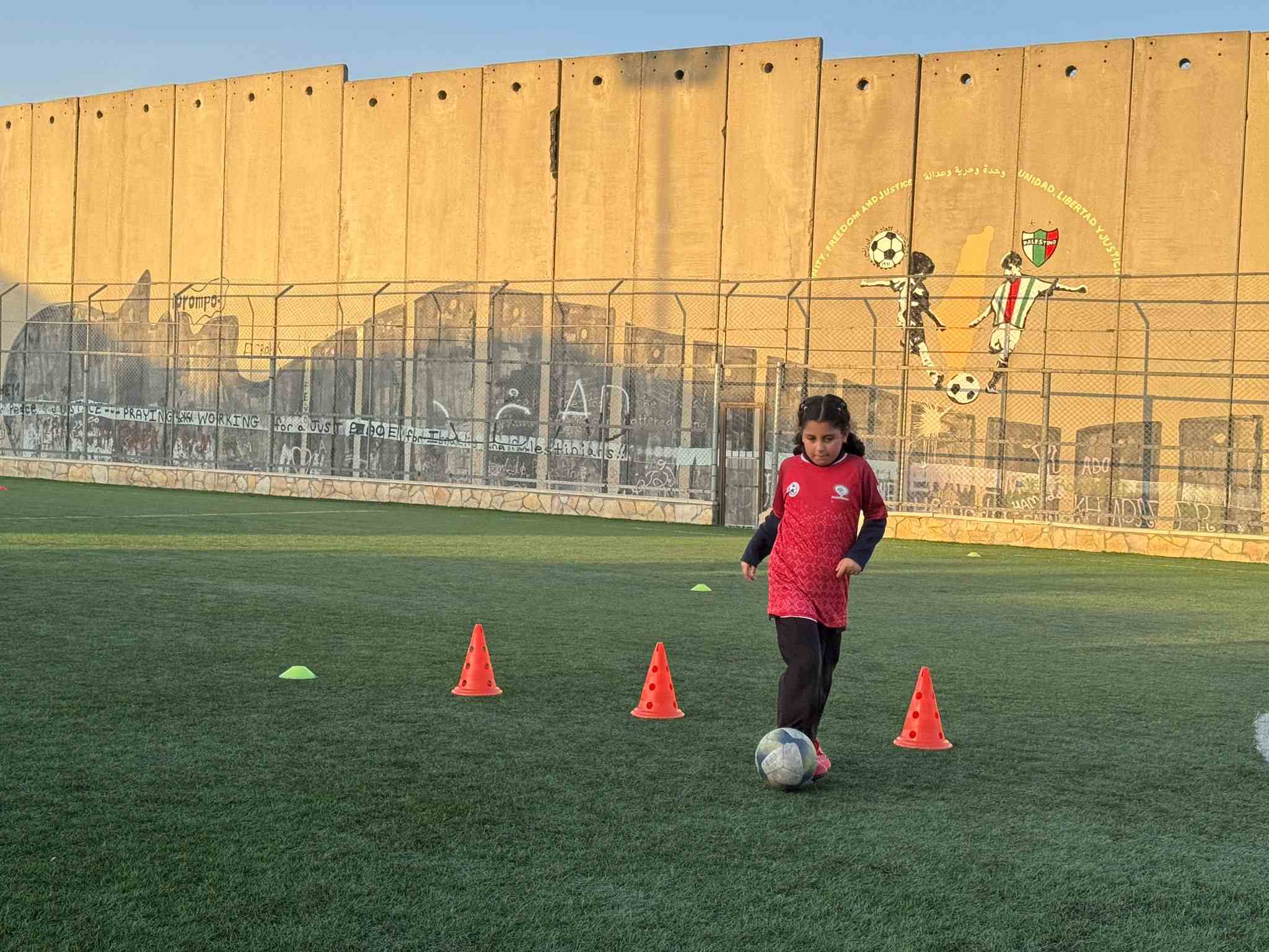 The field’s international connections include a partnership with Chile’s Club Palestino, which represents the Chilean Palestinian community and has provided equipment and organized exchanges. A mural on the separation wall depicts children kicking a football under the slogan “Unity, freedom and justice” in three languages.