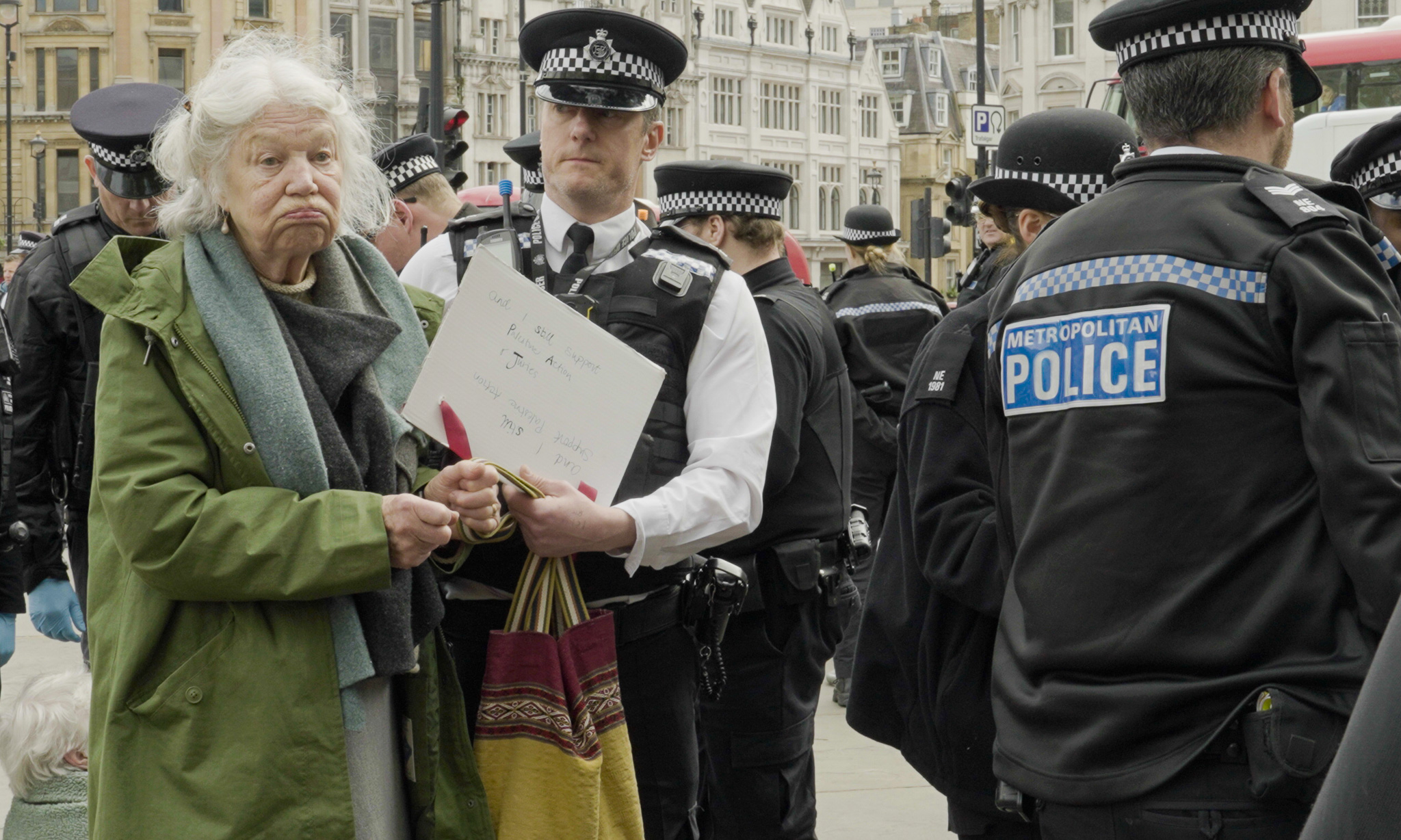 Footage and on-the-ground reporting from the event captured images that have become increasingly common across the UK in the months since the ban was enacted: elderly protesters, many grey-haired, frail, or relying on crutches for mobility, were physically hauled away by officers. A number of demonstrators chose to dress as Suffragettes, the early 20th-century British women’s suffrage activists, to draw a parallel between their current civil disobedience and historical fights for democratic rights. At one point during the arrests, one elderly woman lost consciousness while being carried by officers, and was placed in the recovery position by police as onlookers watched on.