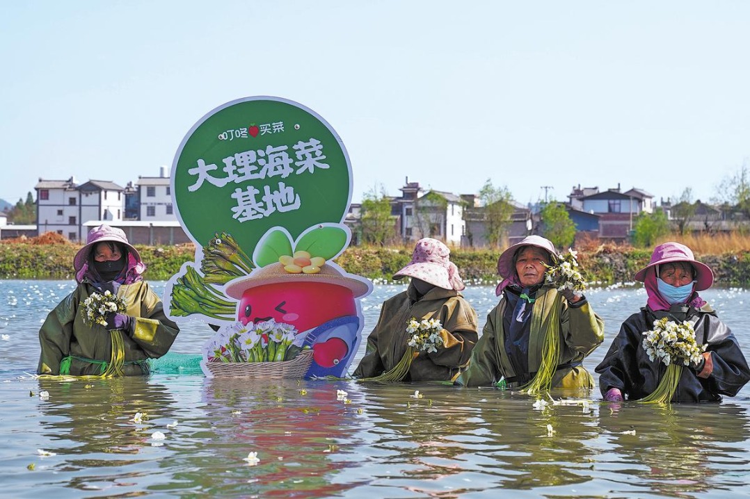 Harvesters immediately submerge the freshly cut Ottelia acuminata in cool lake water to preserve its crisp texture and prevent damage to its delicate stems, before rushing the crop to on-site cold storage facilities for preliminary sorting and processing the same noon. That same afternoon, the packed, temperature-controlled batches depart for Yunnan’s major international airport, bound for Shanghai — a metropolis 2,500 kilometers northeast of Erhai. By early the next day, the vegetable still carries the faint moisture of Erhai Lake when it is unpacked and listed on the digital shelves of leading Chinese fresh e-commerce platform Dingdong Maicai, ready to be ordered and delivered to homes across the city.