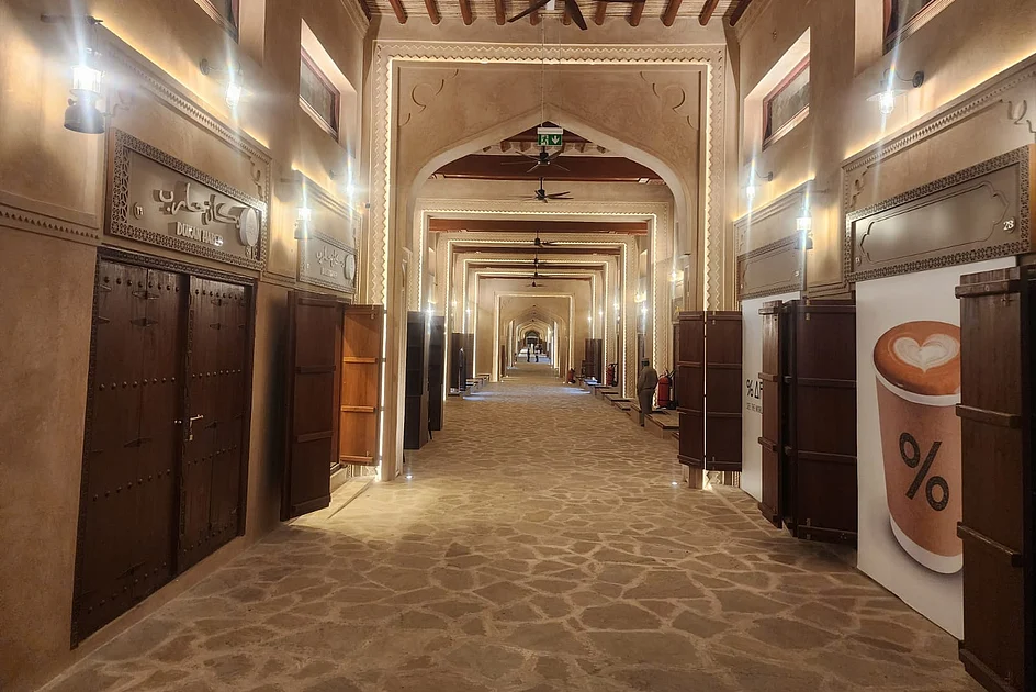 Adjacent to the mosque, the newly opened Souq Sharia’t presents a stark contrast to contemporary shopping malls. Designed with architectural elements reminiscent of traditional Emirati trading towns, the marketplace features sand-colored walls, stone flooring, and heavy wooden doors with decorative metal studs. The complex houses approximately 34 establishments including traditional clothing stores, oud and bakhoor outlets, and coffee houses arranged around a central courtyard with majlis-style seating.