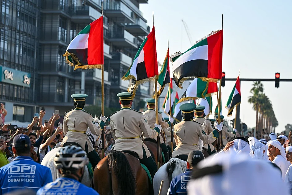 The parade evolved into a moving exhibition of Emirati heritage, with Dubai Police officers on horseback proudly displaying the national flag, followed by the popular K9 unit and an impressive display of police supercars. Interior roads of City Walk were temporarily closed to accommodate the diverse crowd of families, tourists, and long-term residents, many adorned in traditional Emirati attire or UAE flag-colored clothing.